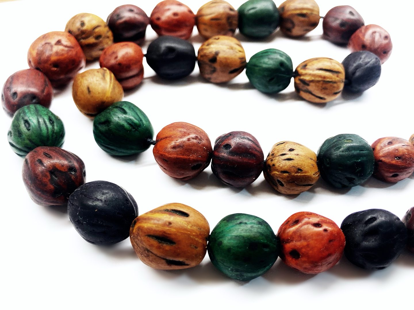 Ο καρπός μοσχοκάρυδου χρησιμοποιείτε για την κατασκευή χαντρών οι οποίες εμποτίζονται με άρωμα λιβάνι το οποίο έχει μεγάλη διάρκεια. Είναι ανθεκτικό και ζεστό στο παίξιμο με ιδανικό βάρος. Oι χάντρες του είναι ανομοιόμορφες σε σχήμα με διάμετρο που κυμαίνεται από 11mm έως 14mm.