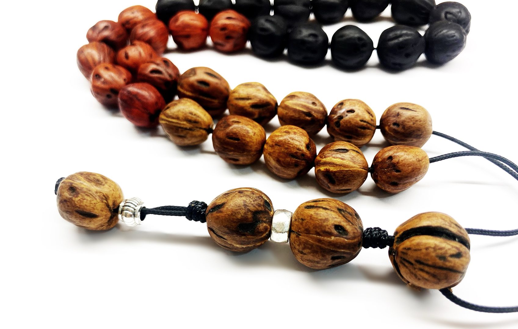 Χειροποίητο κομπολόι με 33 χάντρες από καρπό μοσχοκάρυδου εμποτισμένους με άρωμα λιβάνι τρίχρωμο .
