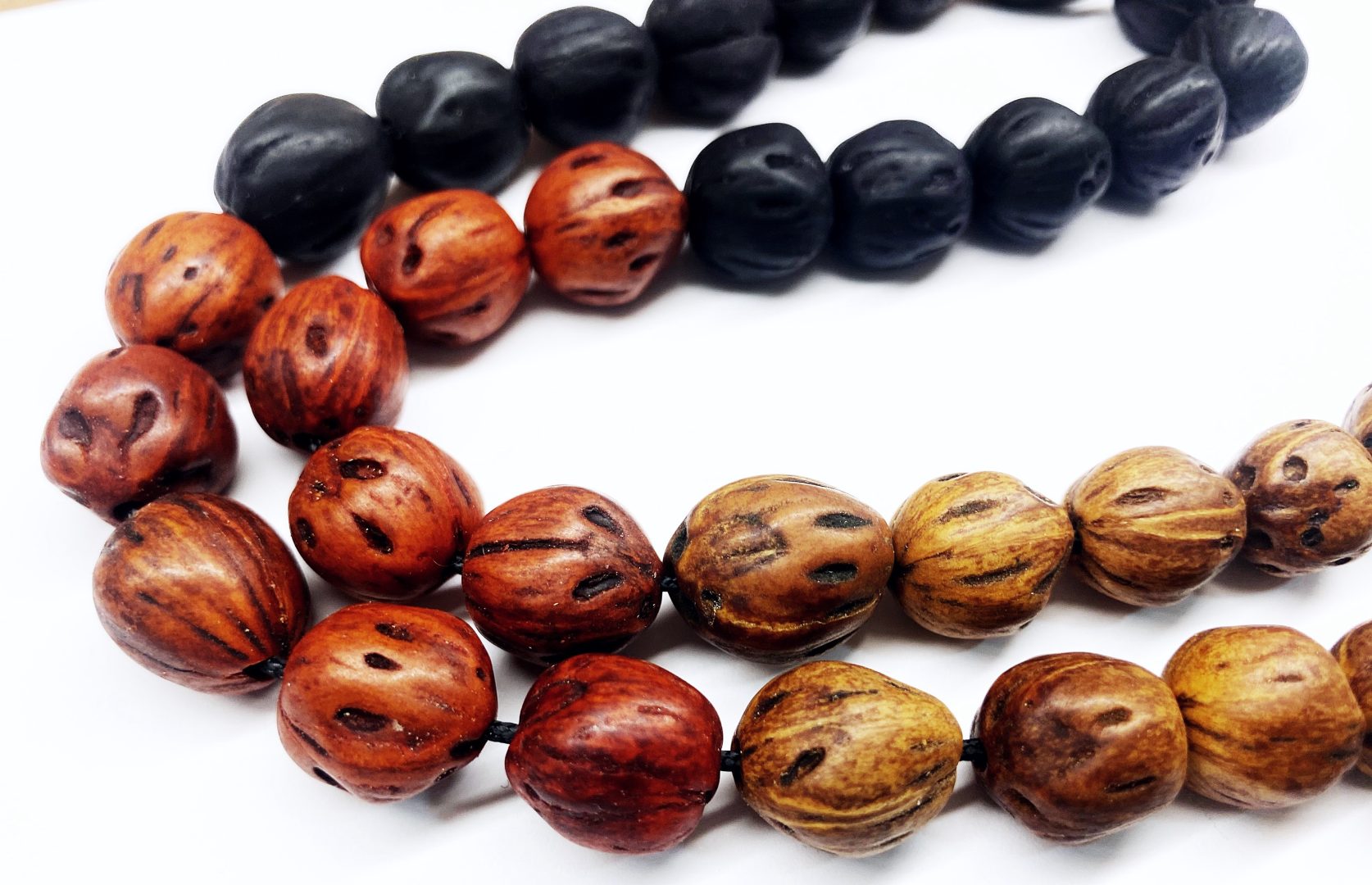 Ο καρπός μοσχοκάρυδου χρησιμοποιείτε για την κατασκευή χαντρών οι οποίες εμποτίζονται με άρωμα λιβάνι το οποίο έχει μεγάλη διάρκεια. Είναι ανθεκτικό και ζεστό στο παίξιμο με ιδανικό βάρος. Oι χάντρες του είναι ανομοιόμορφες σε σχήμα με διάμετρο που κυμαίνεται από 11mm έως 14mm.