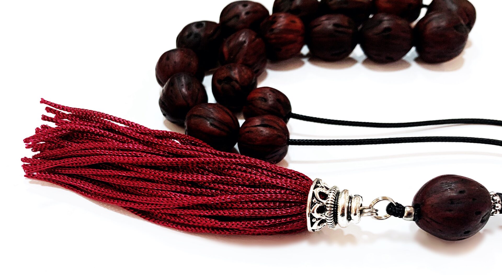 Χειροποίητο κομπολόι από καρπούς μοσχοκάρυδου σε μπορντό χρώμα εμποτισμένους με άρωμα λιβάνι.