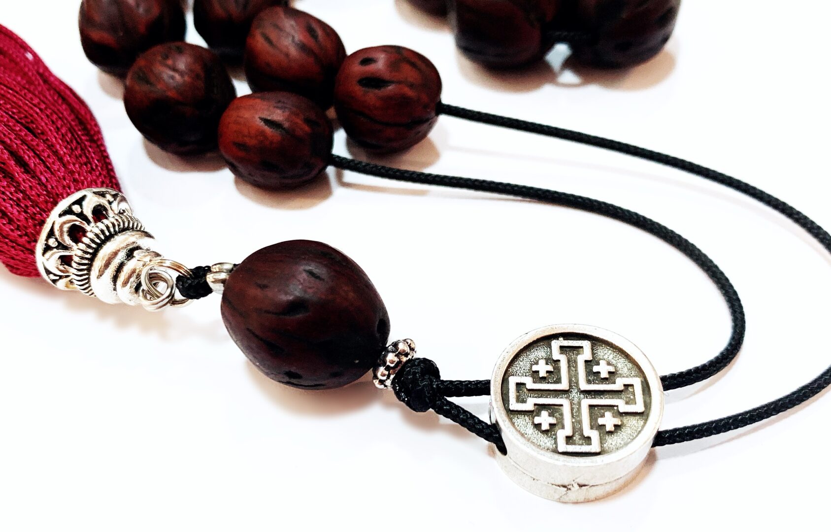 Δεμένο με 17+1 χάντρες, μεταλλικό εκκλησιαστικό θυρεό διπλής όψης και πλούσια φούντα στο τελείωμα.