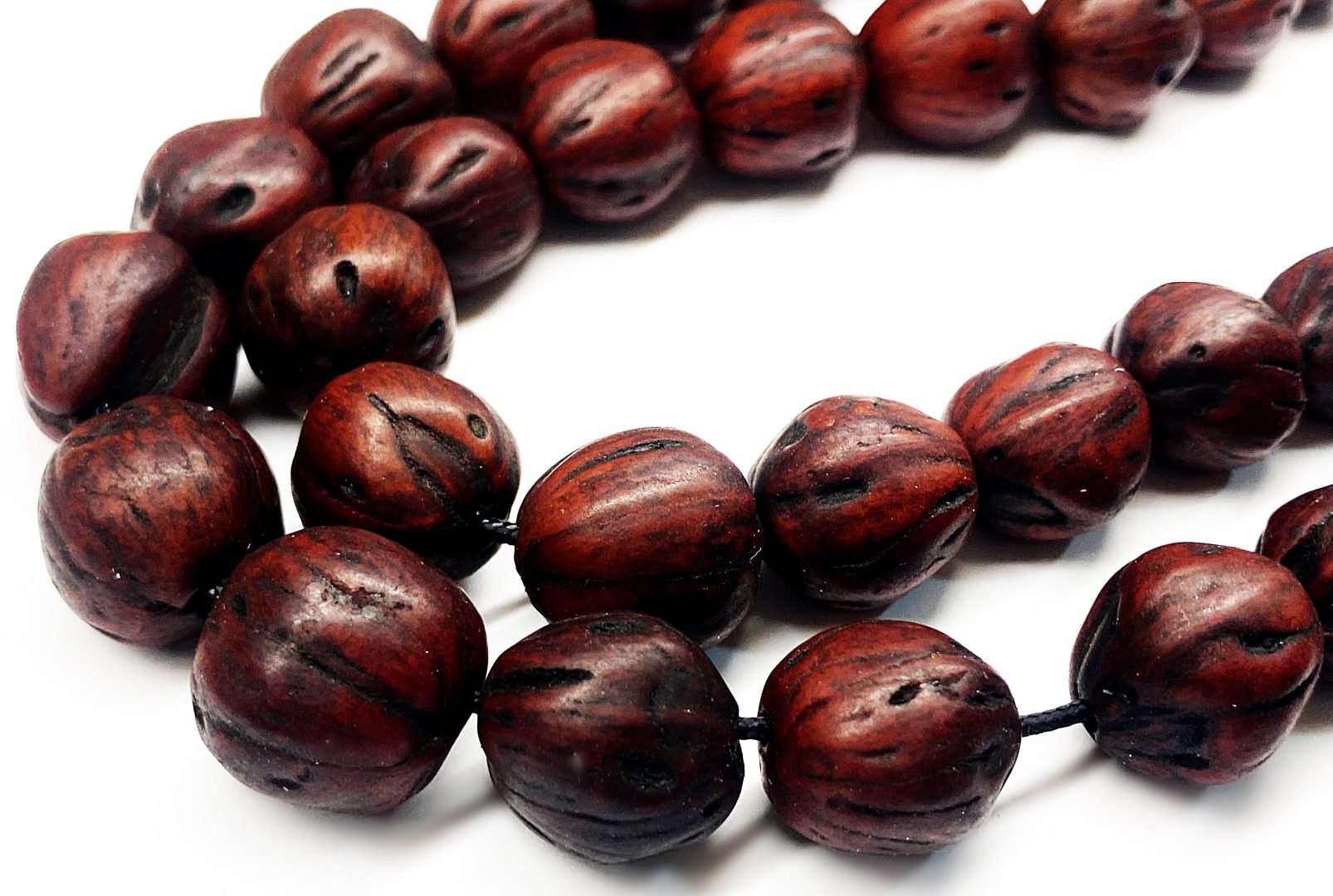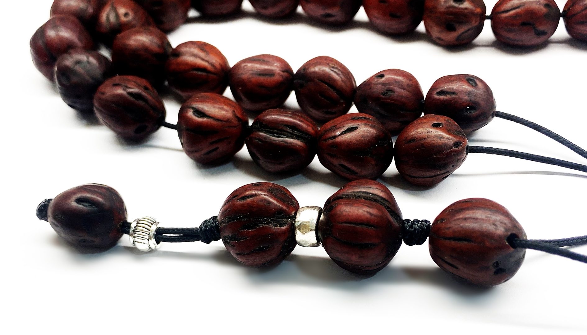 Ο καρπός μοσχοκάρυδου χρησιμοποιείτε για την κατασκευή χαντρών οι οποίες εμποτίζονται με άρωμα λιβάνι το οποίο έχει μεγάλη διάρκεια. Είναι ανθεκτικό και ζεστό στο παίξιμο με ιδανικό βάρος. Oι χάντρες του είναι ανομοιόμορφες σε σχήμα με διάμετρο που κυμαίνεται από 11mm έως 14mm.
