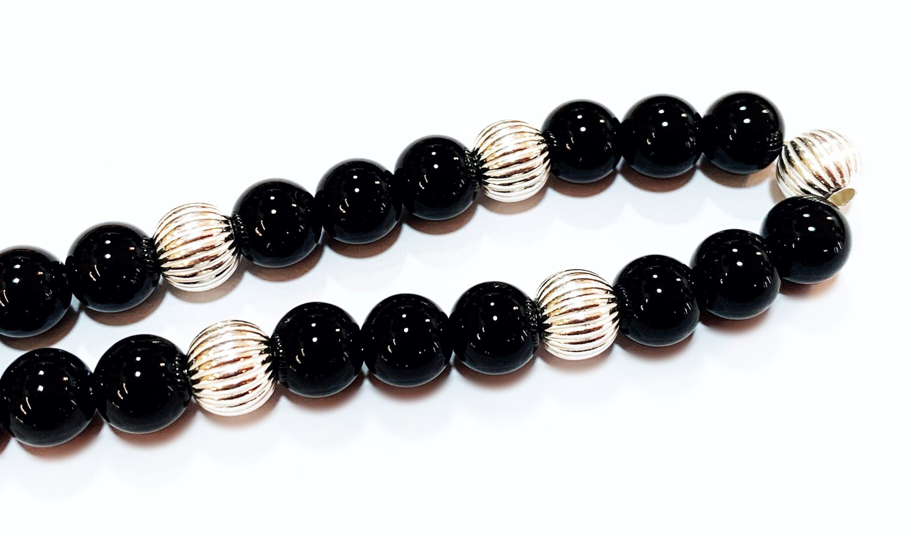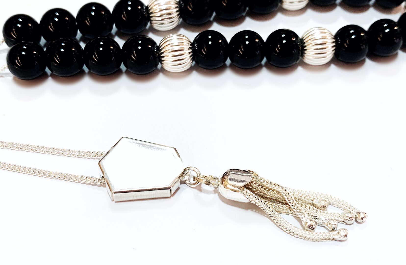 Ασημένιο κομπολόι με ημιπολύτιμες χάντρες από Όνυχα μαύρο σε στρογγυλό σχήμα .