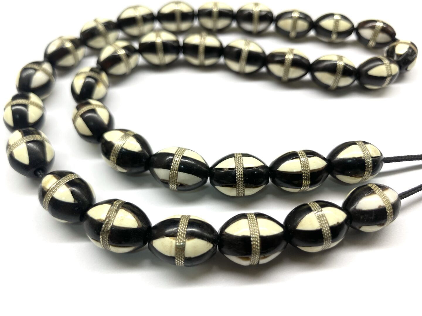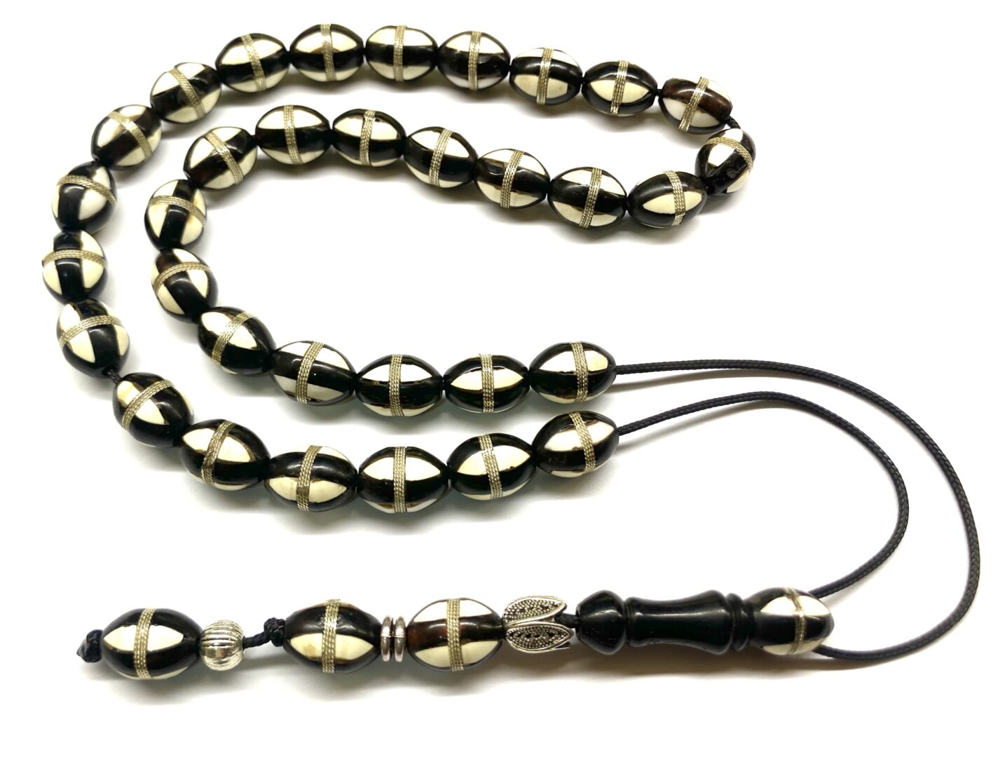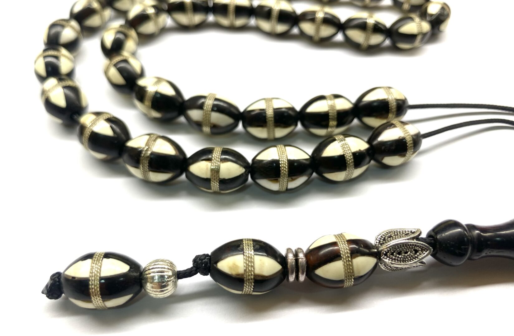 Χειροποίητο κομπολόι 33άρι από ξύλο φοινικόδεντρου Κούκ σκουρόχρωμο στολισμένο με ασήμι και ένθετα από λευκή πάστα.