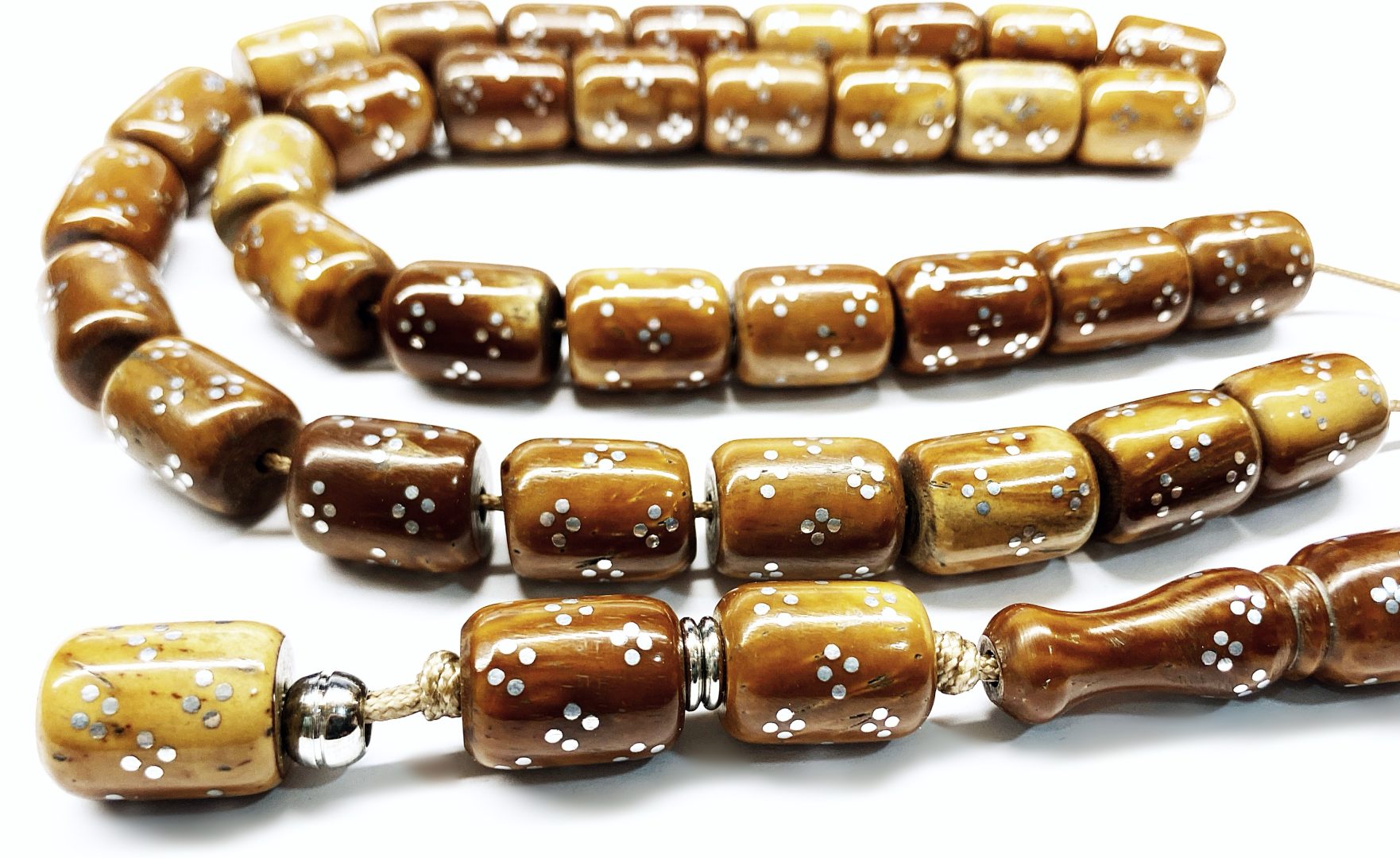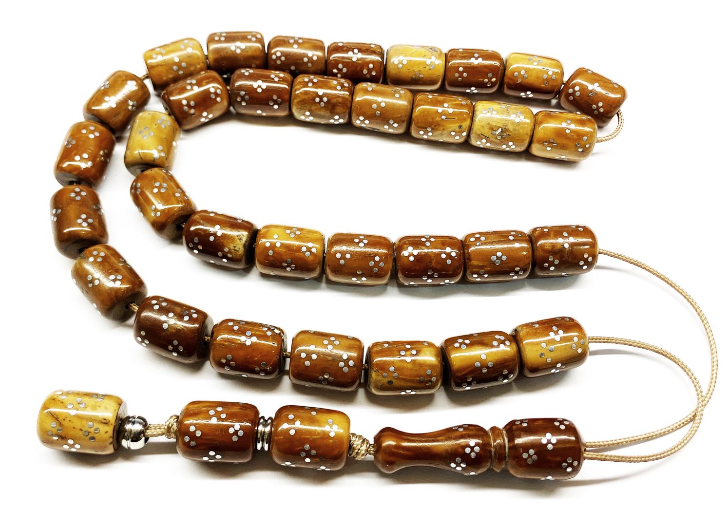 Χειροποίητο κομπολόι 33άρι από ξύλο φοινικόδεντρου Κούκ κεντημένο με ασήμι σε σχήμα βαρελάκι