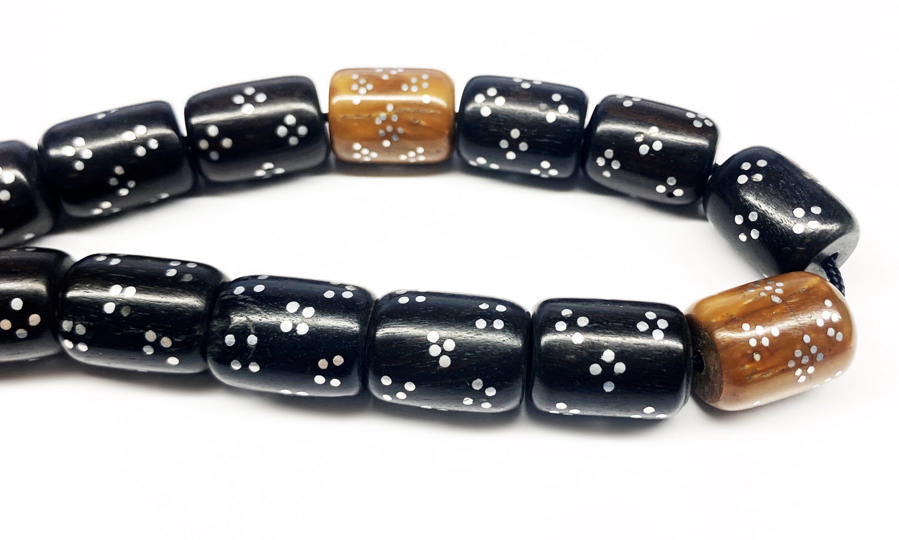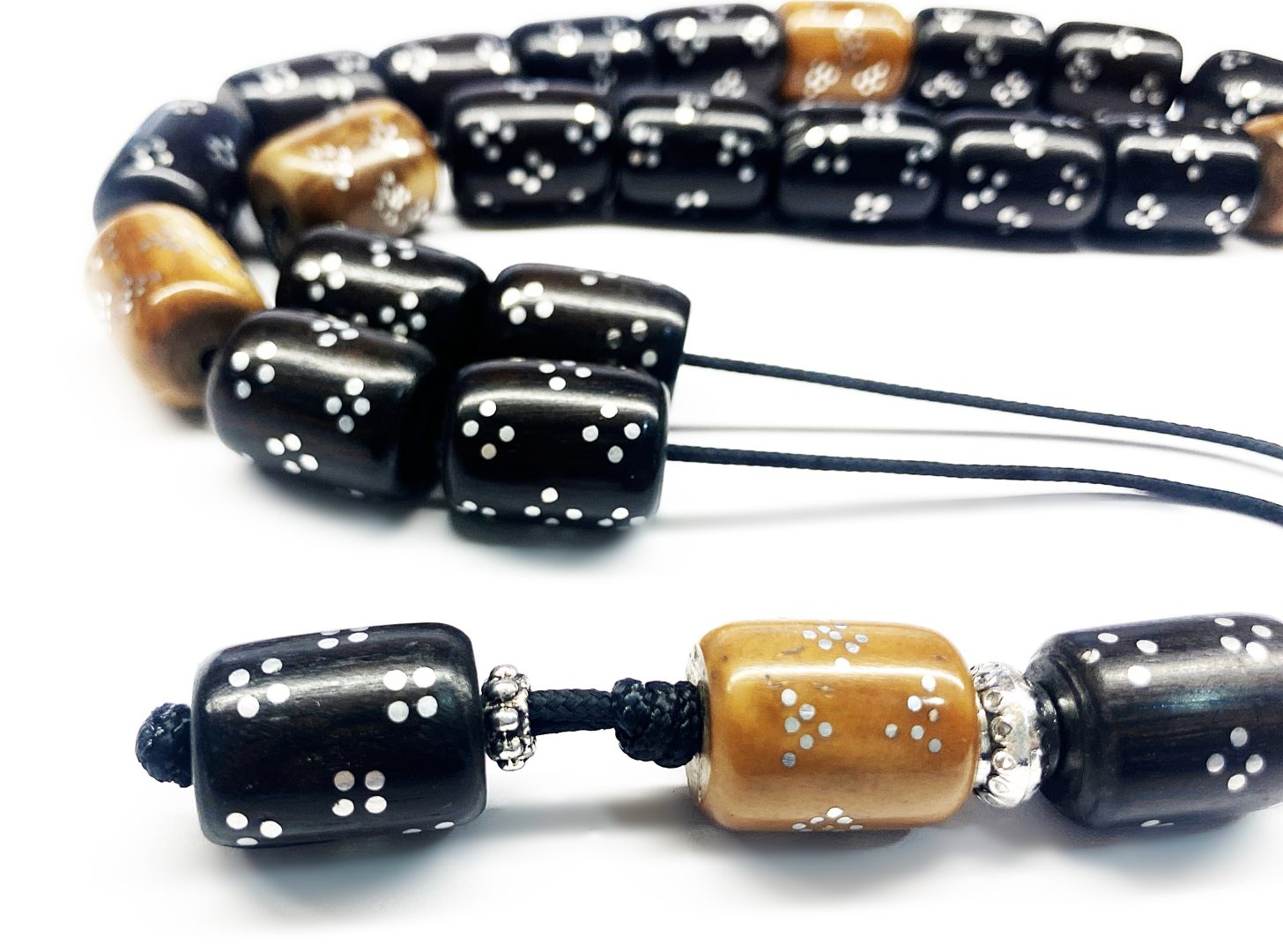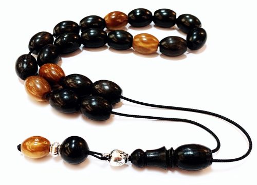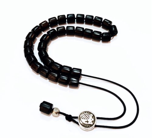 Χειροποίητο κομπολόι από ξύλο Έβενου και ξύλο φοινικόδεντρου Κουκ , με κεντημένο ασήμι σε κάθε χάντρα.