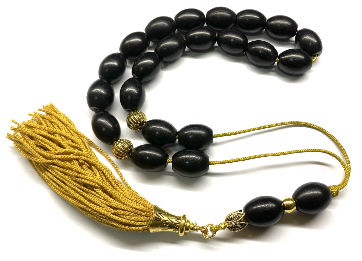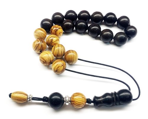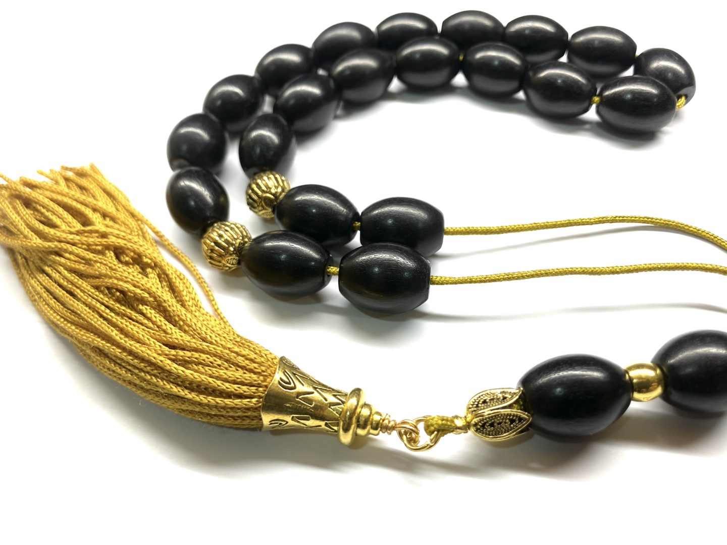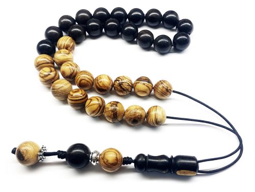 Χειροποίητο κομπολόι από ξύλο Έβενου σε σχήμα ελιά με χρυσά στοιχεία .