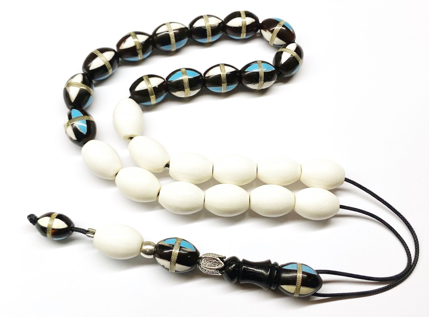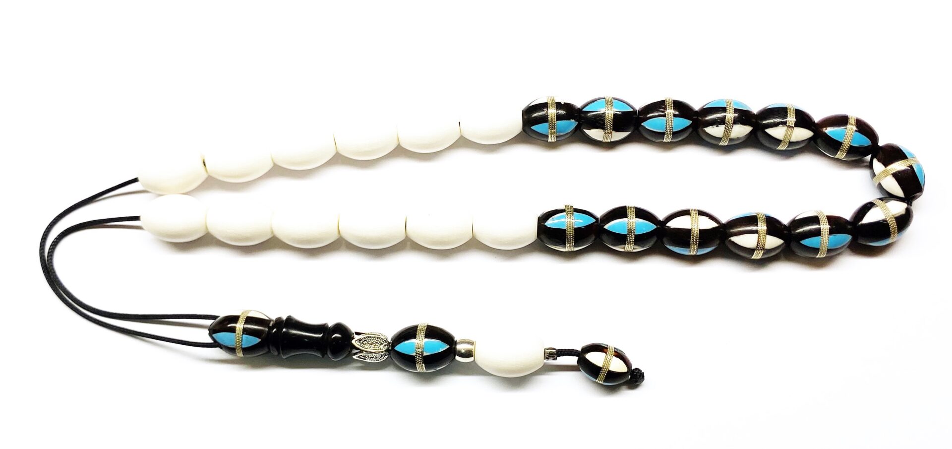 Χειροποίητο κομπολόι με 25 χάντρες από κόκκαλο καμήλας και Κούκ με ένθετα σε σχήμα ελιάς.