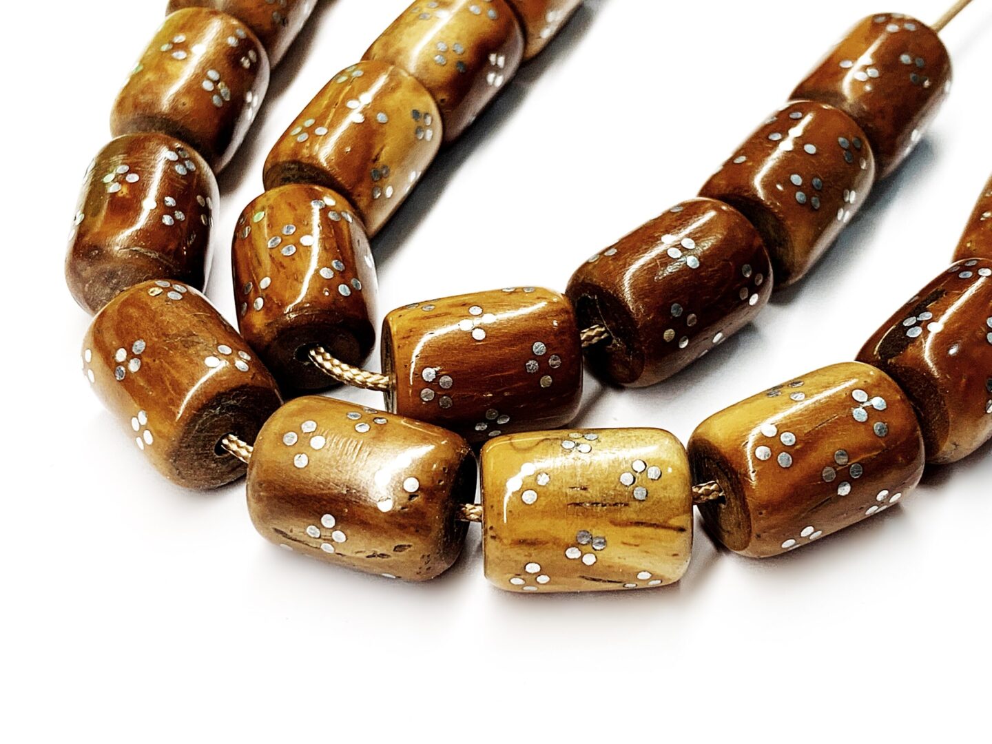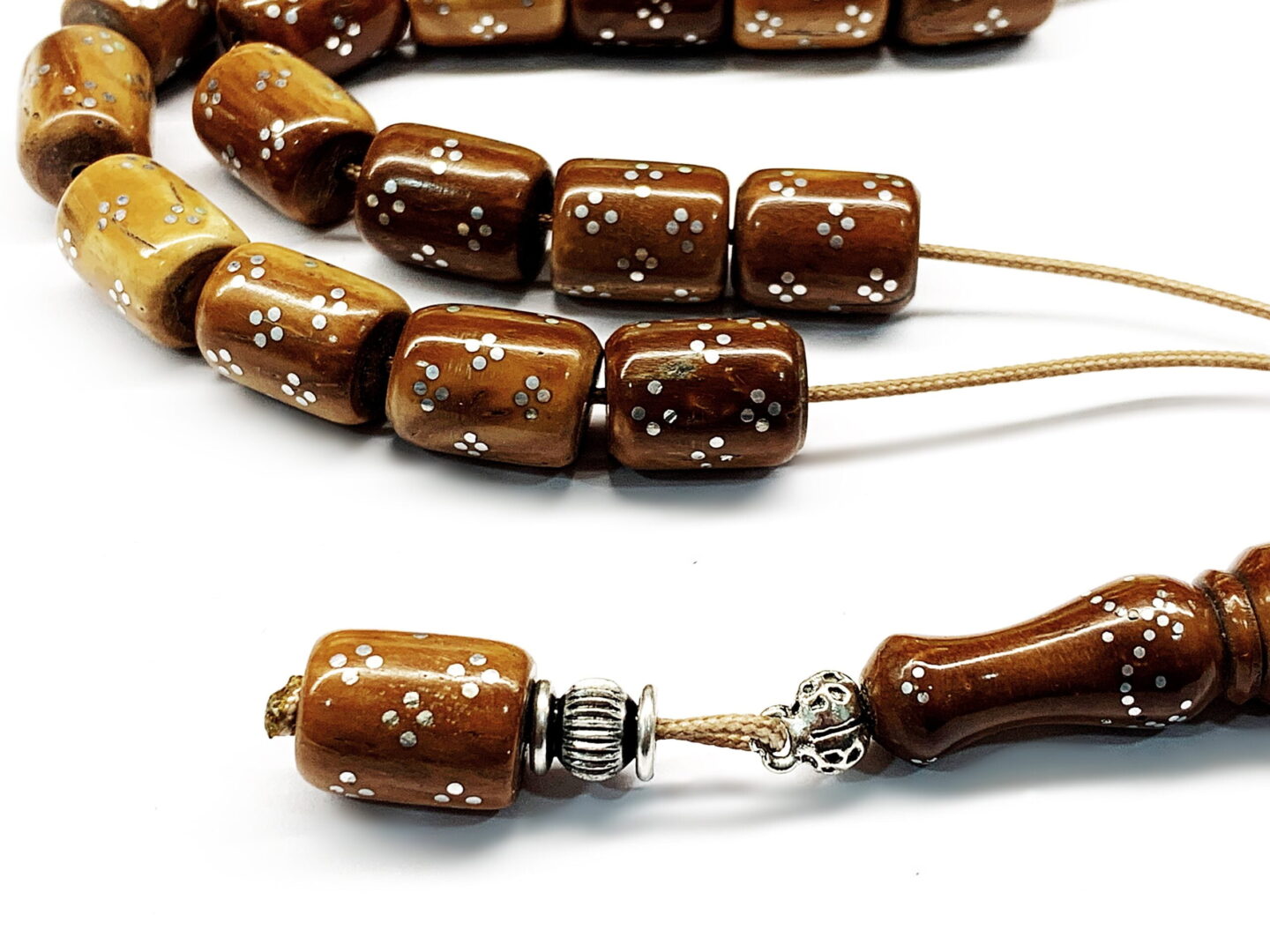 Χειροποίητο κομπολόι από ξύλο φοινικόδεντρου Κούκ κεντημένο με ασήμι σε σχήμα βαρελάκι