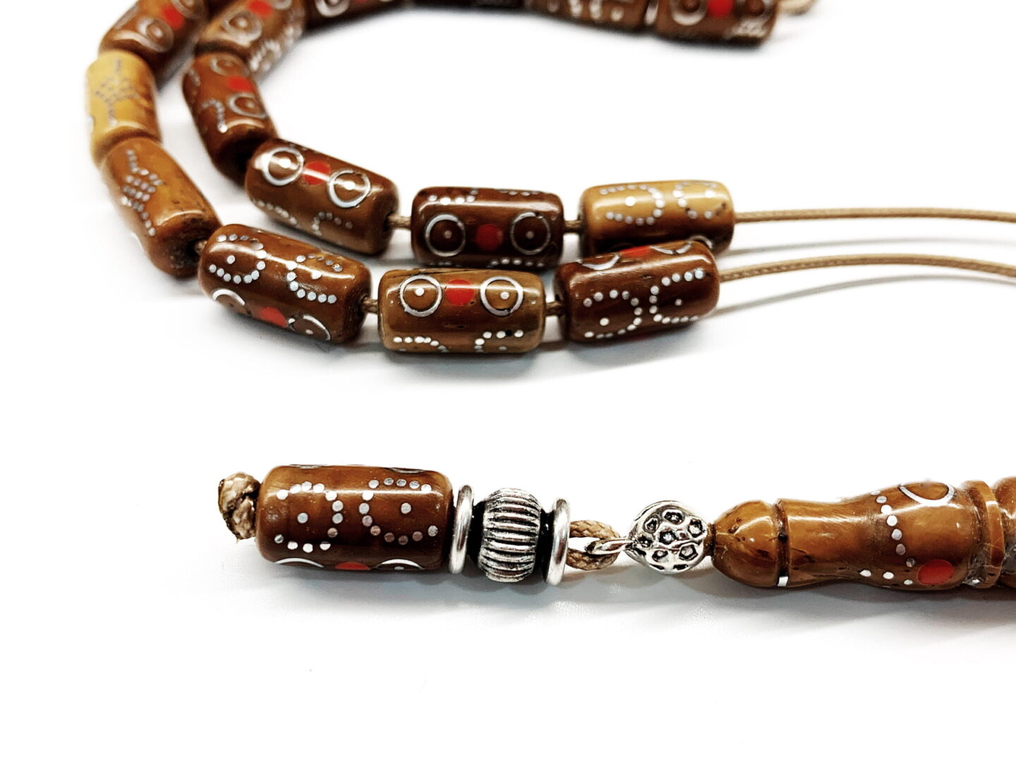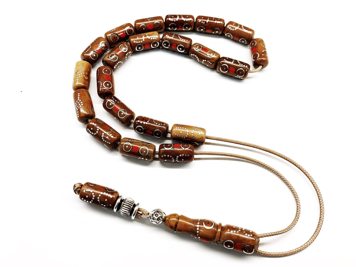 Χειροποίητο κομπολόι από ξύλο φοινικόδεντρου Κούκ με ένθετα από χρωματισμένη πάστα κεντημένο με ασήμι .