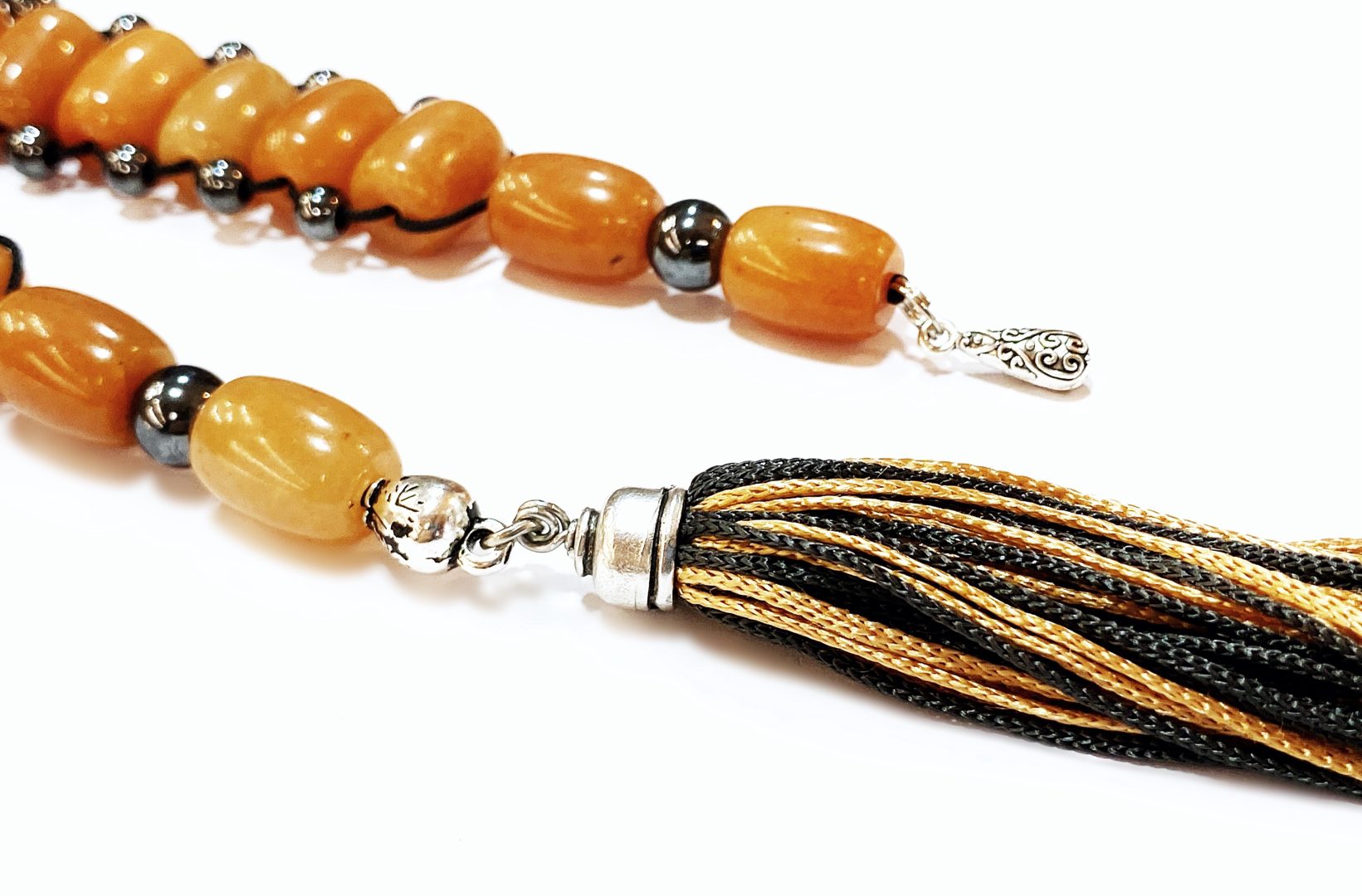 Δεμένο με 20 + 4 χάντρες με μεταλλικό στοιχεία στο ένα τελείωμα και φούντα στο άλλο.