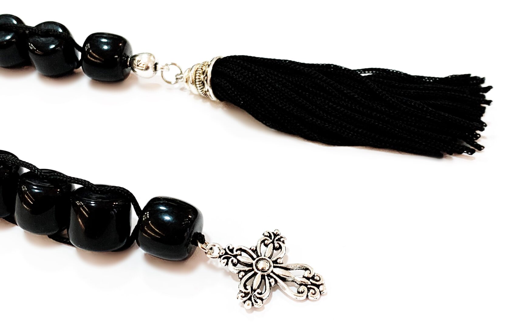 Δεμένο με 15 + 2 χάντρες, πλούσια φούντα στο ένα τελείωμα και μεταλλικός σταυρός στο άλλο.
