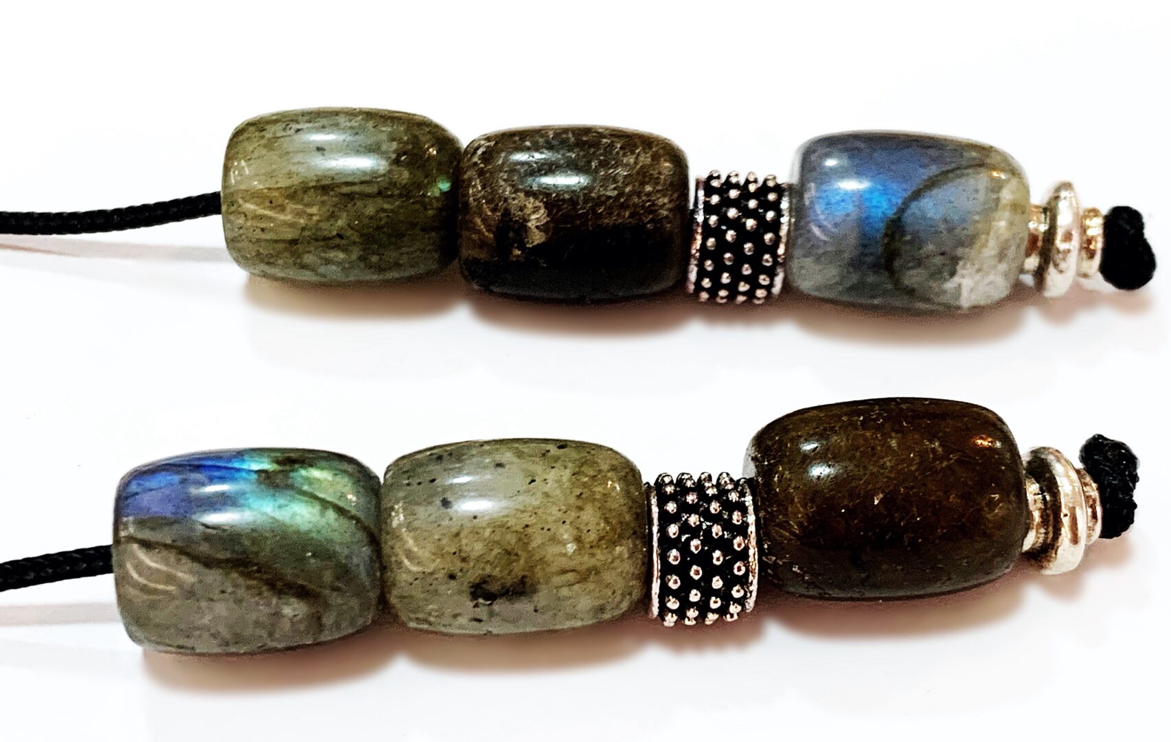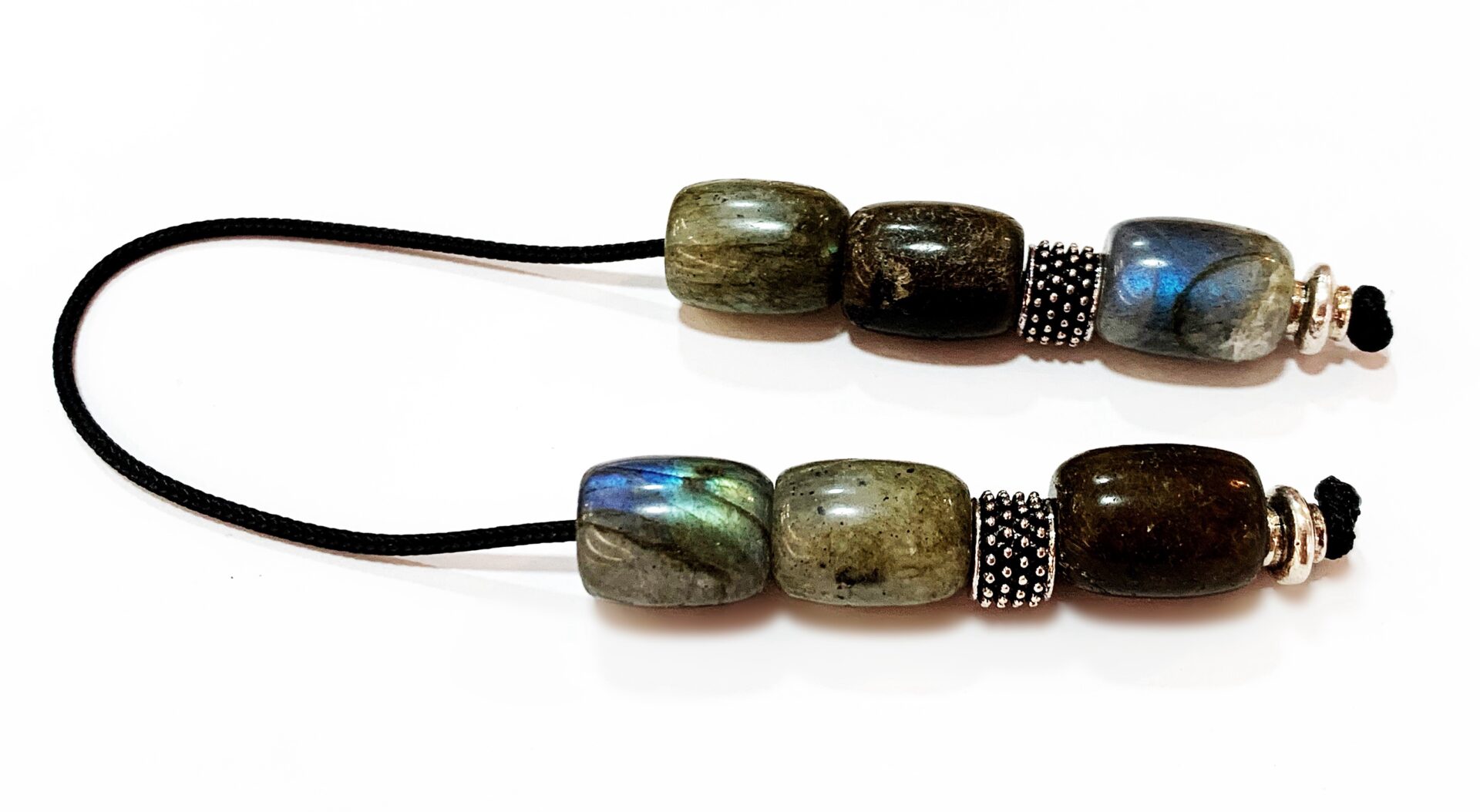 Χειροποίητο μπεγλέρι από ημιπολύτιμες χάντρες Λαμπραδορίτη σε σχήμα βαρελάκι .