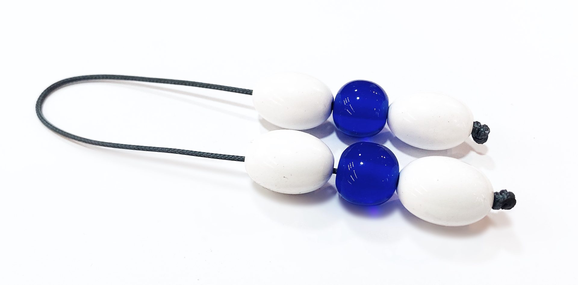 Χειροποίητο μπεγλέρι από ρητίνη δεμένο με 4 λευκές σε σχήμα οβάλ και 2 μπλε ρουά σε στρογγυλό σχήμα.
