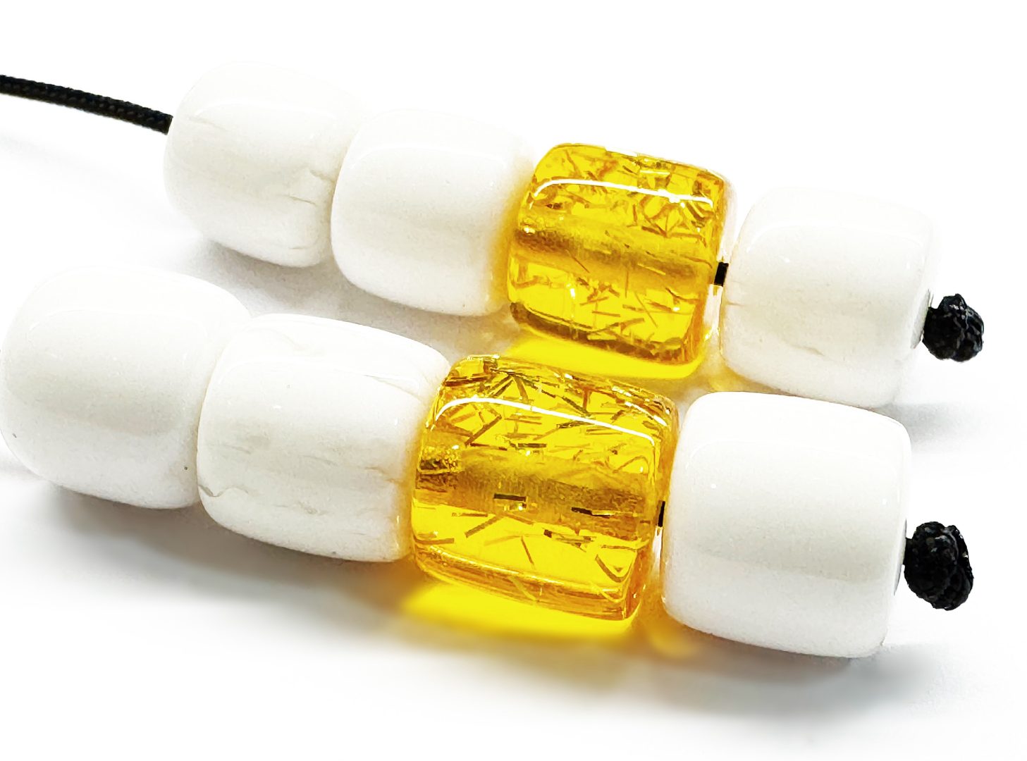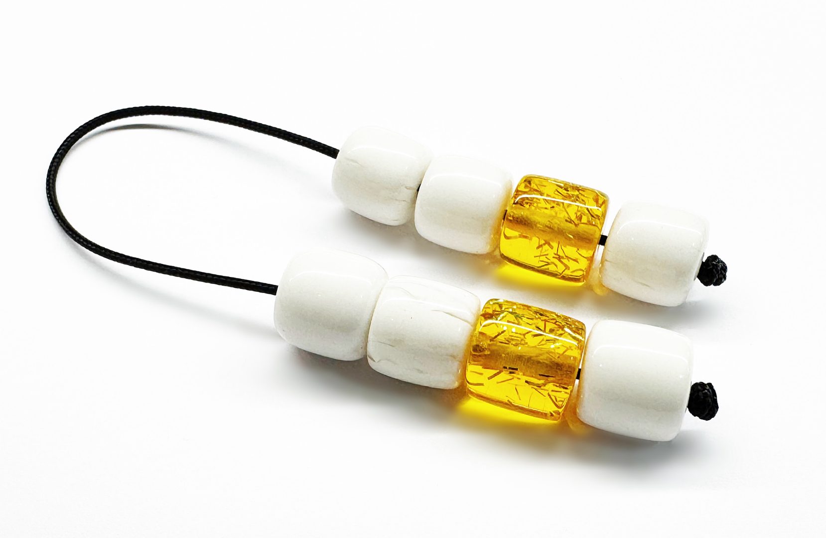 Χειροποίητο μπεγλέρι από ρητίνη δεμένο με 8 χάντρες σε λευκό και κίτρινο χρώμα.