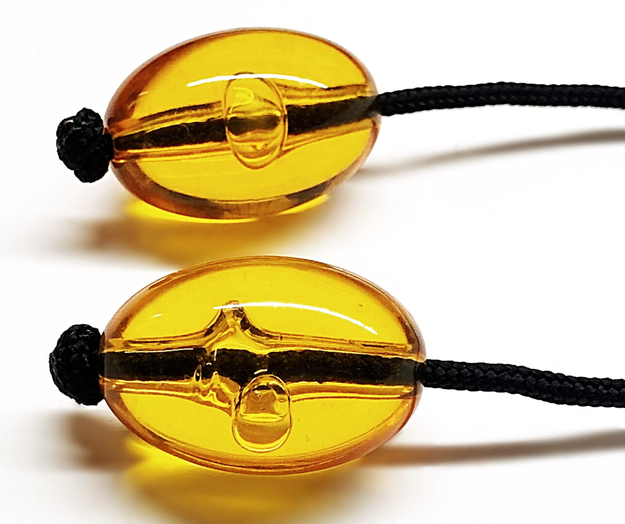 Χειροποίητο μπεγλέρι από ρητινη δεμένο με δύο μεγάλες χάντρες στο χρώμα του κεχριμπαριού.