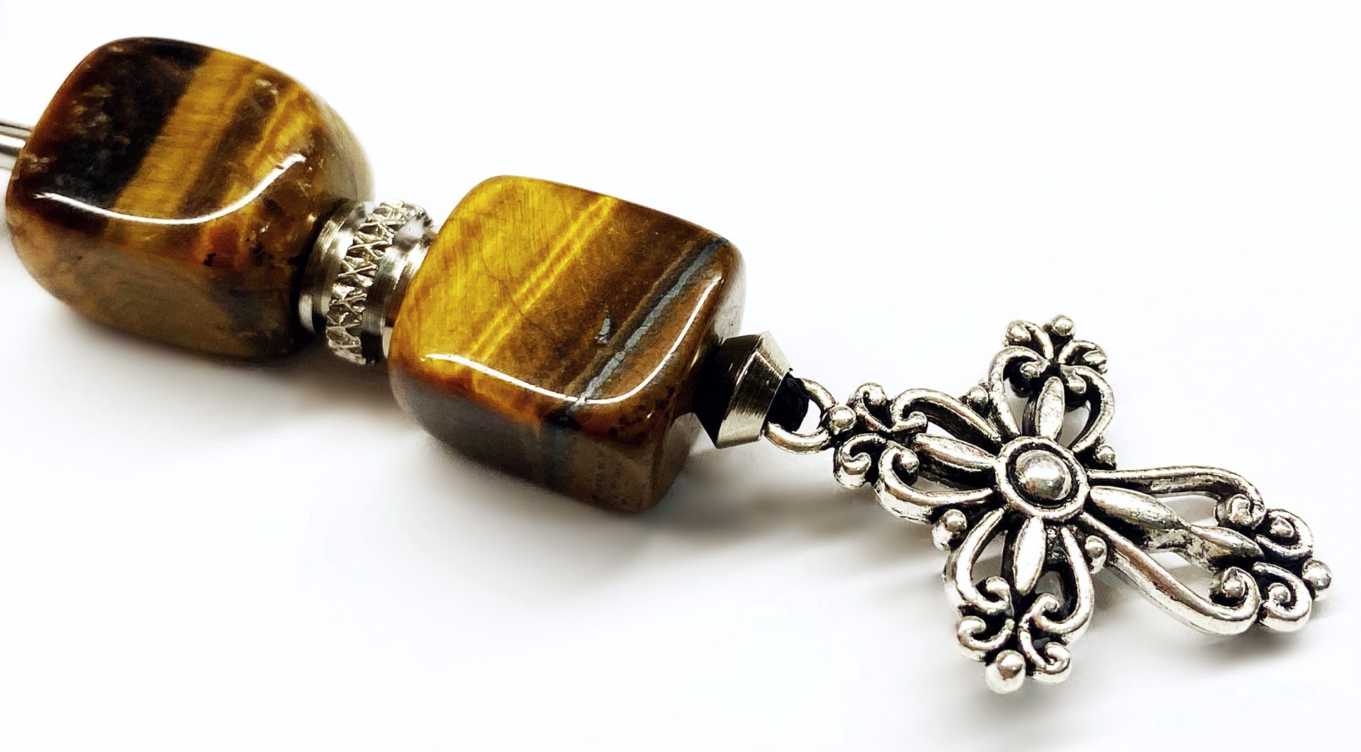 Χειροποίητο μπρελόκ με χάντρες από ημιπολύτιμο λίθο Μάτι τίγρης και μεταλλικό περίτεχνο σταυρό από Αλπακά.
