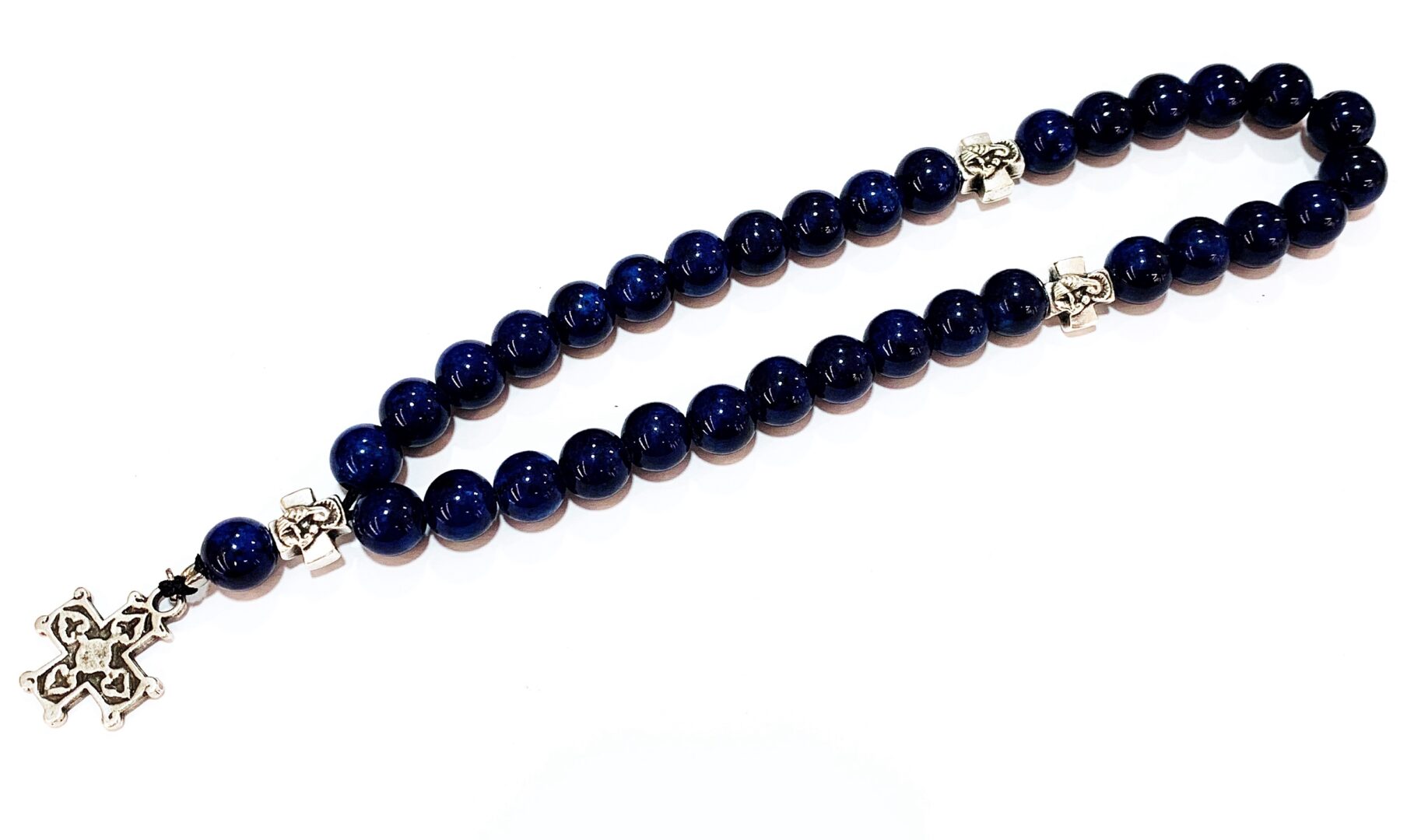 Δεμένο με 33+1 χάντρες ,3 χάντρες μεταλλικές σε σχήμα σταυρού και στο τελείωμα μεταλλικός σταυρός.