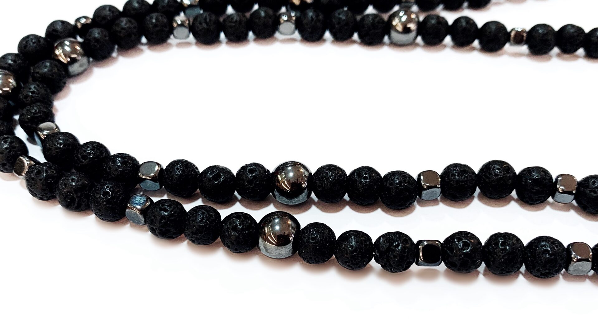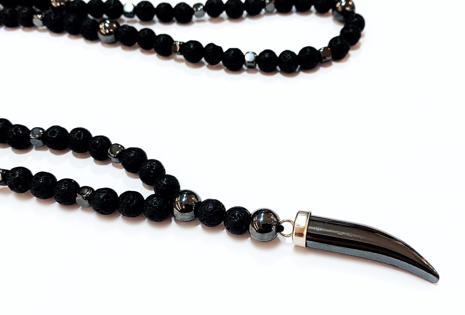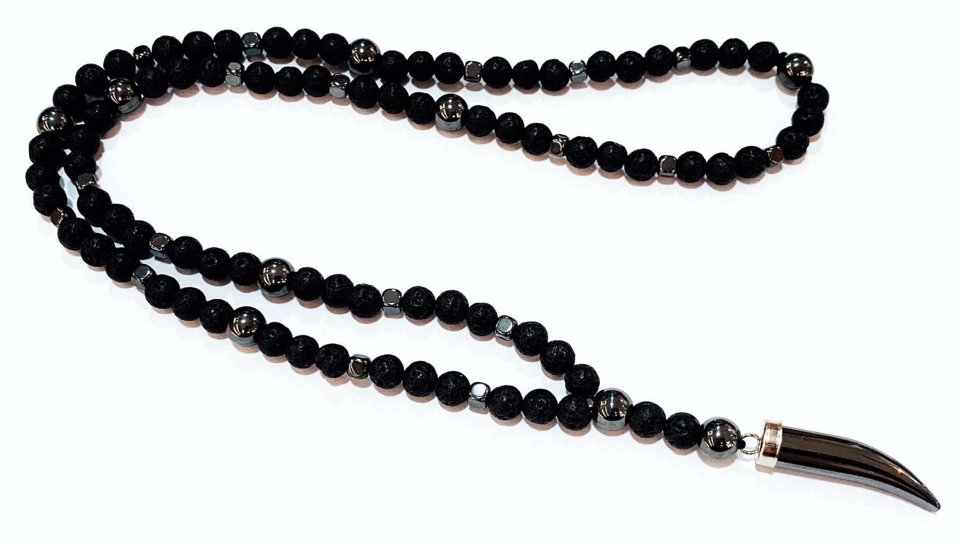 Χειροποίητο ροζάριο λαιμού από ημιπολύτιμους λίθους Λάβα και Αιματίτη με δόντι από Αιματίτη στο τελείωμα.