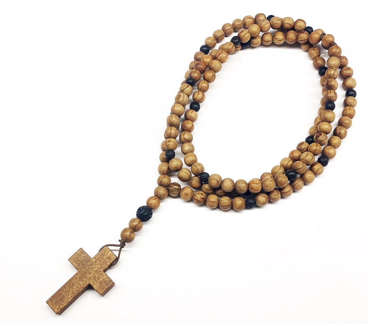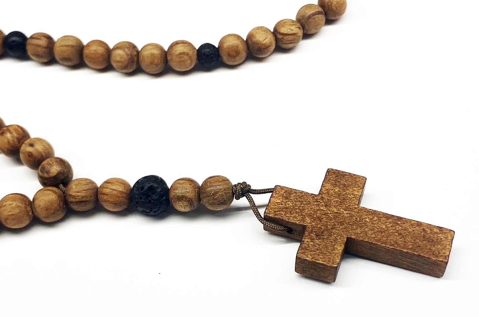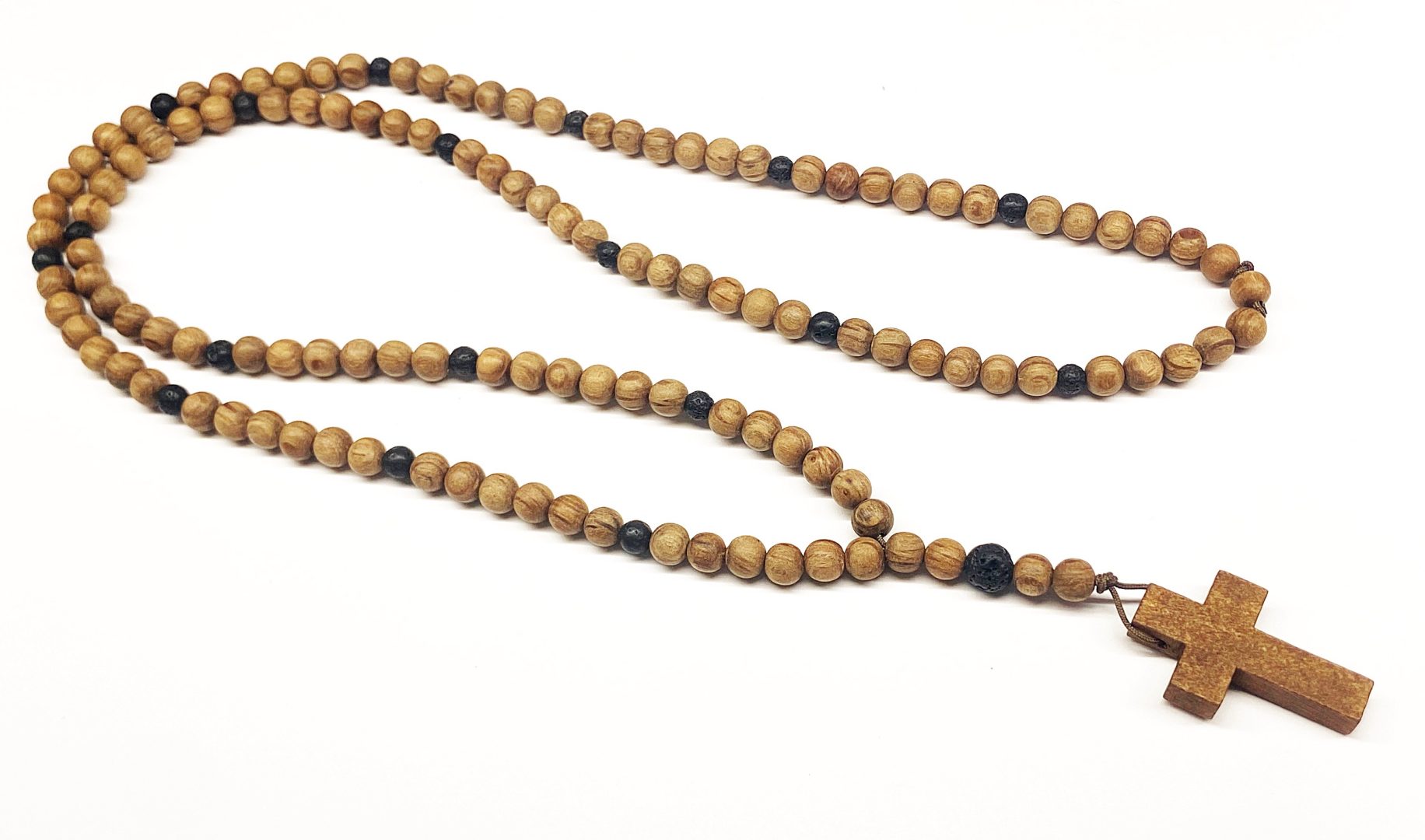 Χειροποίητο ροζάριο λαιμού από ξύλο ελιάς και λάβα σε στρογγυλό σχήμα στο τελείωμα  φέρει ξύλινο σταυρό.